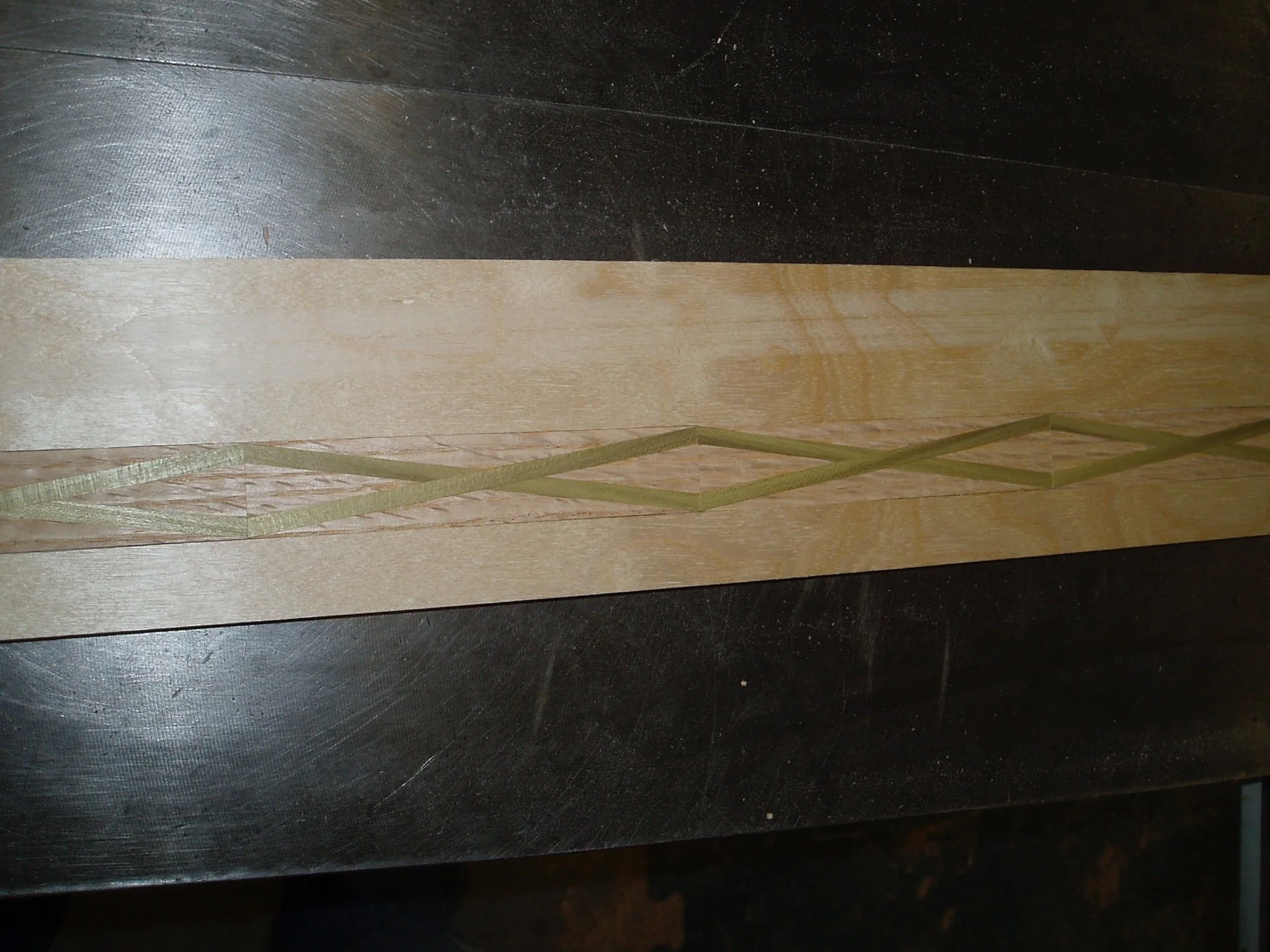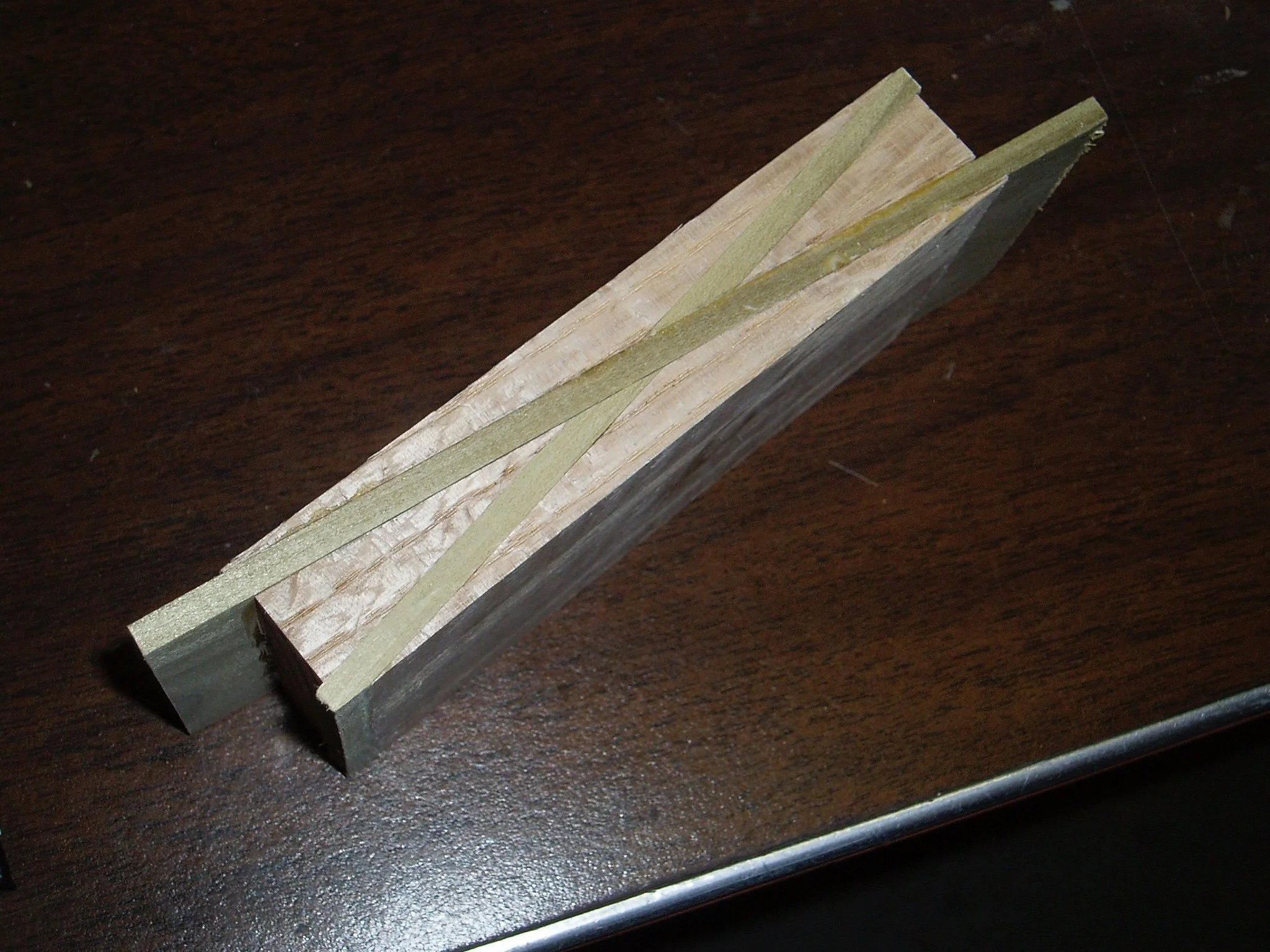 In this way, I was able to create about four feet of decorative banding. I have it somewhere out in my garage, ready to be used when I am. I’m sure by now the green poplar has oxidized to a lovely shade of chocolate brown against the stripes of the red oak.